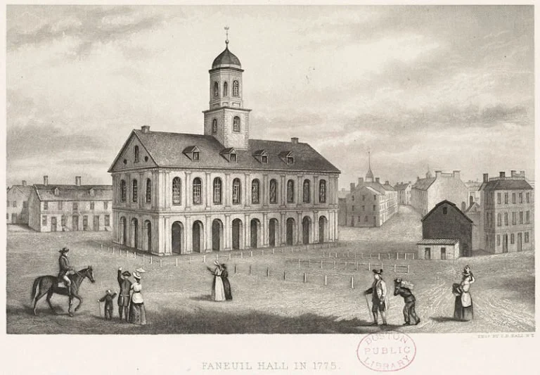 Below is an engraving of Faneuil Hall in 1775. By 1800, Boston would have been built up a bit.