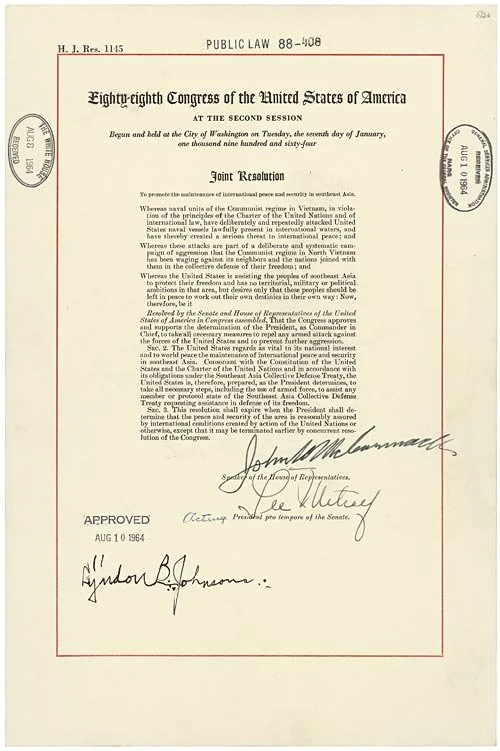 In early August 1964, two US destroyers stationed in the Gulf of Tonkin reported that they had been fired upon by North Vietnamese forces. The Gulf of Tonkin Resolution authorized President Johnson to take measures “to retaliate and to promote the maintenance of international peace and security in southeast Asia.” The resolution was broadly defined and used by President Johnson and Nixon to fight in the Vietnam War. This type of resolution cannot be separated from the general and pervasive concern about the threat of communism. Supporters argued that presidential action was justified by the need to prevent the falling “dominoes” of states to Communist regimes, starting with China and Korea. In retrospect, this argument seems a bit hyperbolic to us, but at the time it was pretty consuming.